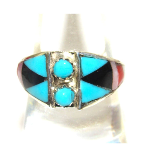 Vintage Zuni Inlay Ring Size 7 1/2 Snake Eye Turquoise Coral Jet Sterling Silver