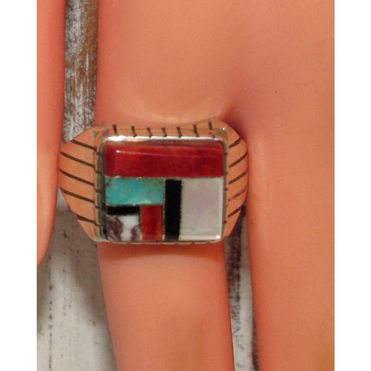 Navajo Turquoise Coral Wild Horse Inlay Ring Size 12 Sterling R. Jack