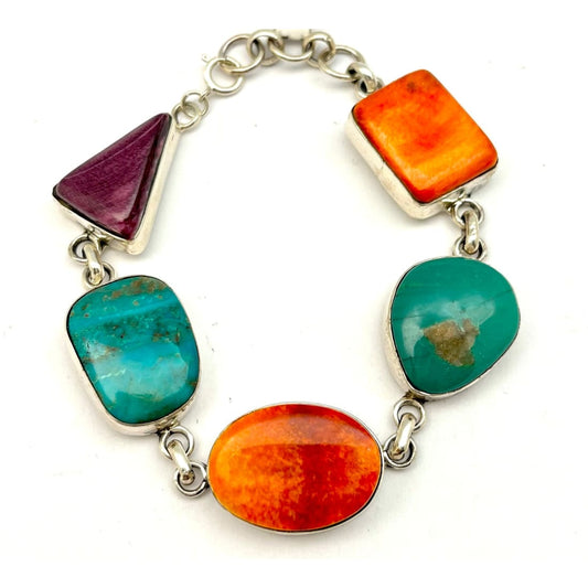 Navajo Turquoise Orange Purple Spiny Adjustable Link Bracelet Sterling J. Yazzie