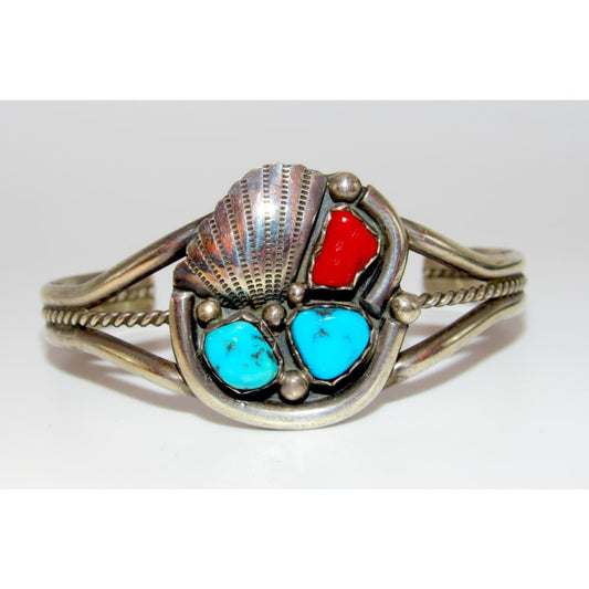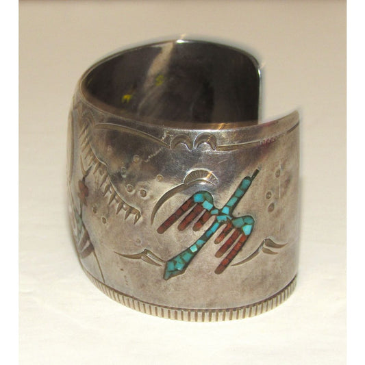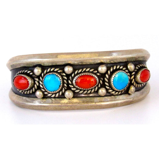 Old Pawn Navajo Gibson Gene Cuff Bracelet Sterling Silver Turquoise Coral