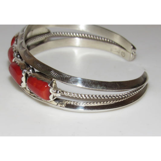Signed Navajo Mediterranean Coral Cuff Bracelet Sterling Silver Native American