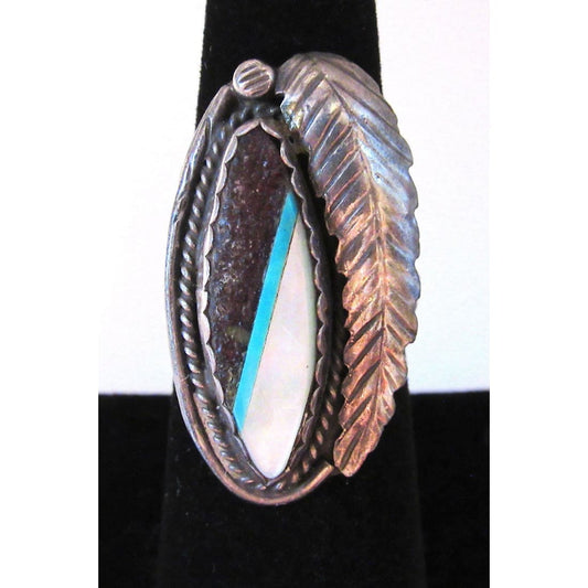 Vintage Navajo Inlay Ring Sz 8 Sterling Turquoise Mother or Pearl