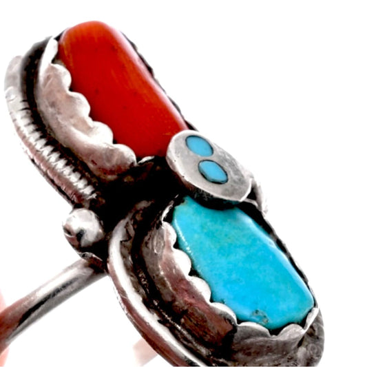 Vintage Zuni Snake Ring Sz 8 Turquoise Coral Sterling Silver Effie Calavaza