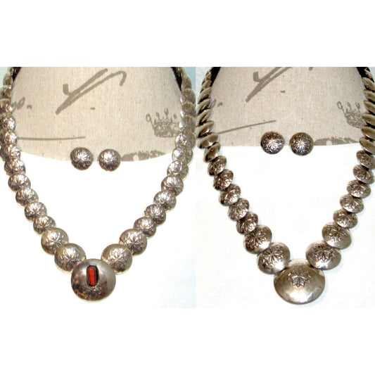 Vintage Navajo Pearls Reversible Necklace Earrings Coral Ingot Pillow Beads Sterling