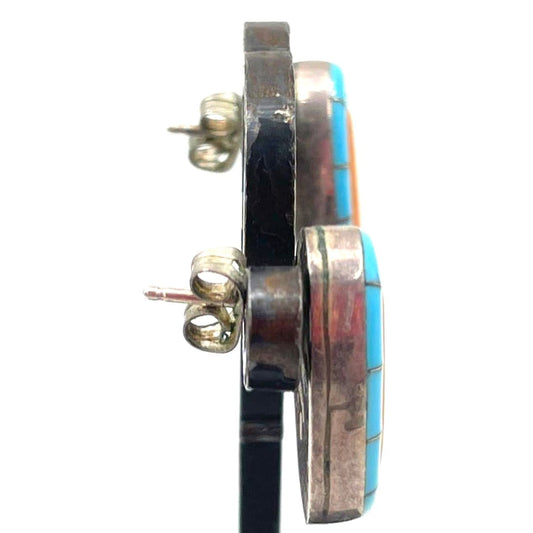 Vintage Navajo Orange Spiny Turquoise Inlay Sterling Silver Earrings Signed