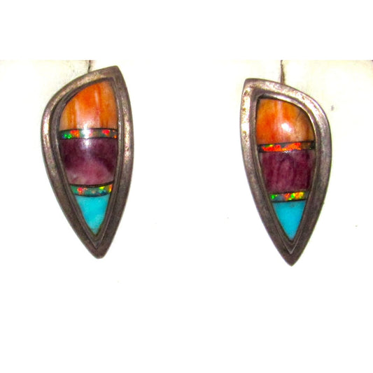 Navajo Turquoise Inlay Post Earrings Opal Spiny Sterling Silver Vintage