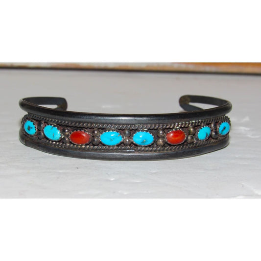 Old Pawn Navajo Carved Turquoise Coral Sterling Silver Stacker Cuff Bracelet