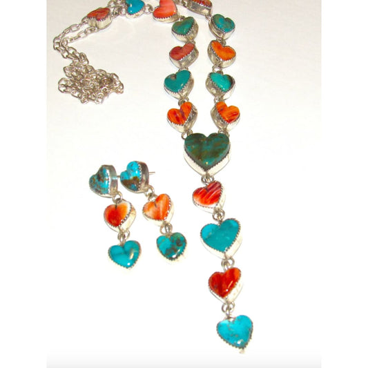 Navajo Turquoise Spiny Heart Lariat Necklace Earrings Set Sterling Silver