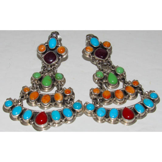 Vintage Zuni Inlay Dangle Earrings Turquoise Spiny Oyster Sterling Silver