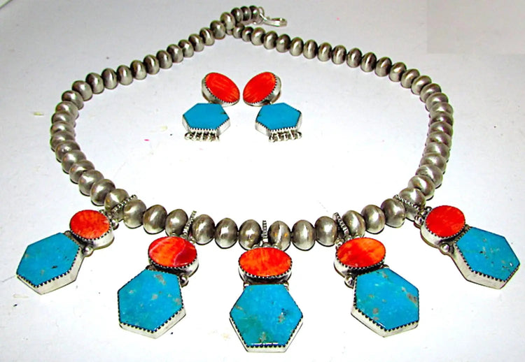 Navajo Turquoise Red Spiny Lariat Necklace Earrings Set Vernon Clarissa Hale