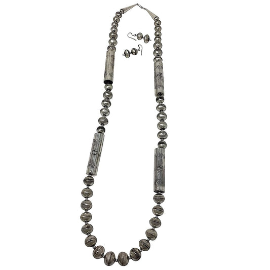 Navajo Pearls Hand Stamped Necklace & Earrings Set Sterling Silver Saucer Beads