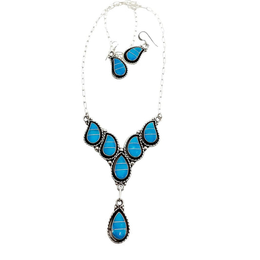 Zuni Turquoise Inlay Necklace and Earrings Set Sterling Silver F Lowsayatee