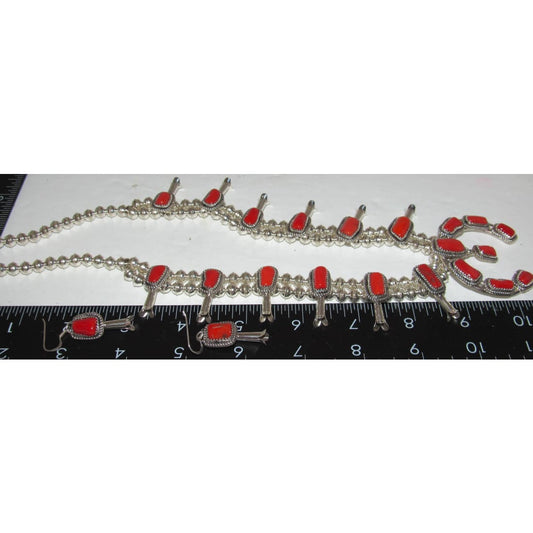 Navajo Mediterranean Coral Squash Blossom Necklace & Earrings Set Sterling A. Johnson