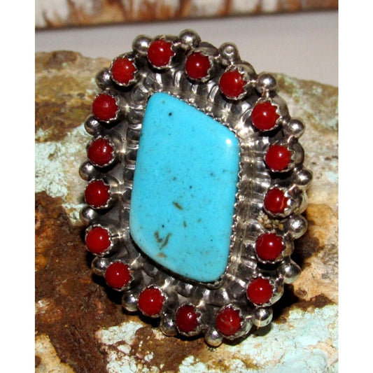 Navajo Turquoise Coral Cluster Ring Size 9 Sterling Silver Signed Native
