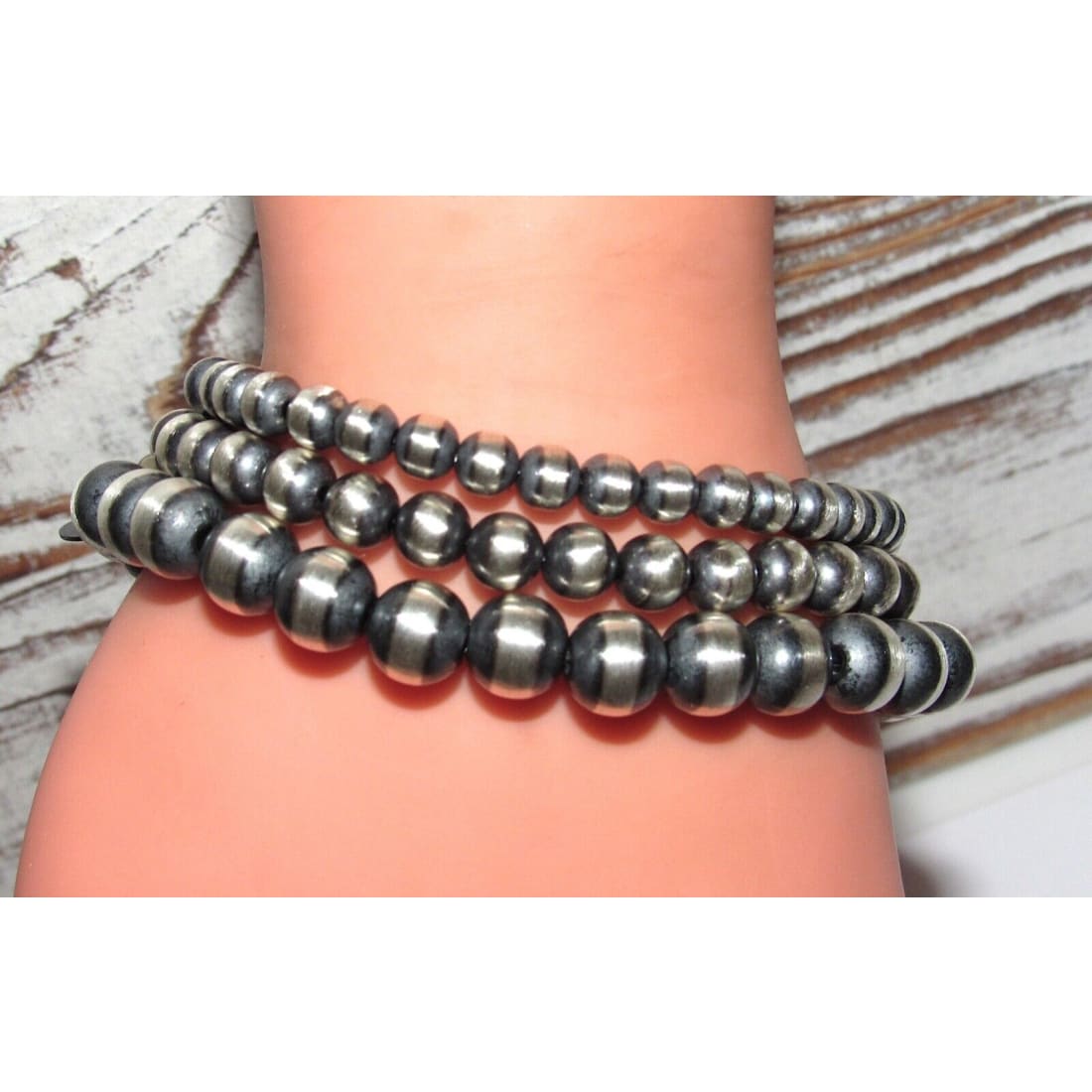 Fab 5mm Navajo pearls sterling silver hand made stretch bracelet. The beads are oxidized on each end and are polished in the center. Great to layer with other bracelets or wear by itself. The inside circumference is about 7" and is adjustable/stretchy. Classic design to complement any outfit.