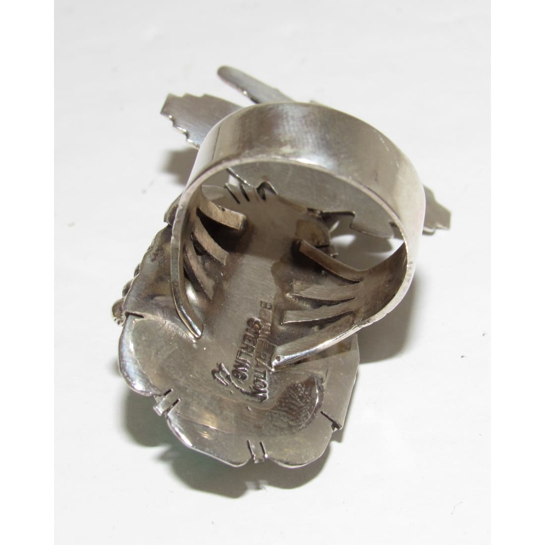 Phenomenal Navajo sterling silver and gorgeous Kingman turquoise statement Butterfly Kachina ring in size 8 by the highly collectible Navajo artist Bennie Ration. Marked sterling and is signed by the artist. Exceptional craftsmanship and attention to detail. Stunning example of Native American hand crafted jewelry to add to any jewelry collection. Measures a little under 2" tall on the front. Please refer to the pictures for additional details. Amazing statement example of wearable Native American art.