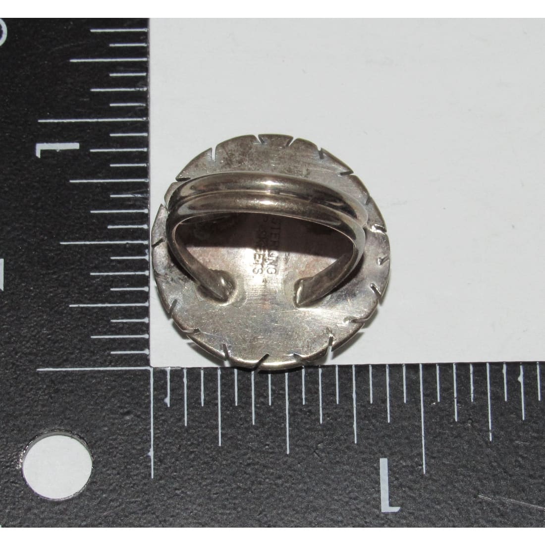 Navajo Sterling silver ring with a Kingman turquoise, twist wire and stamped scalloped border in size 7.. It measures approximately 7/8" long. It is Navajo hand made by Peggy Skeets.