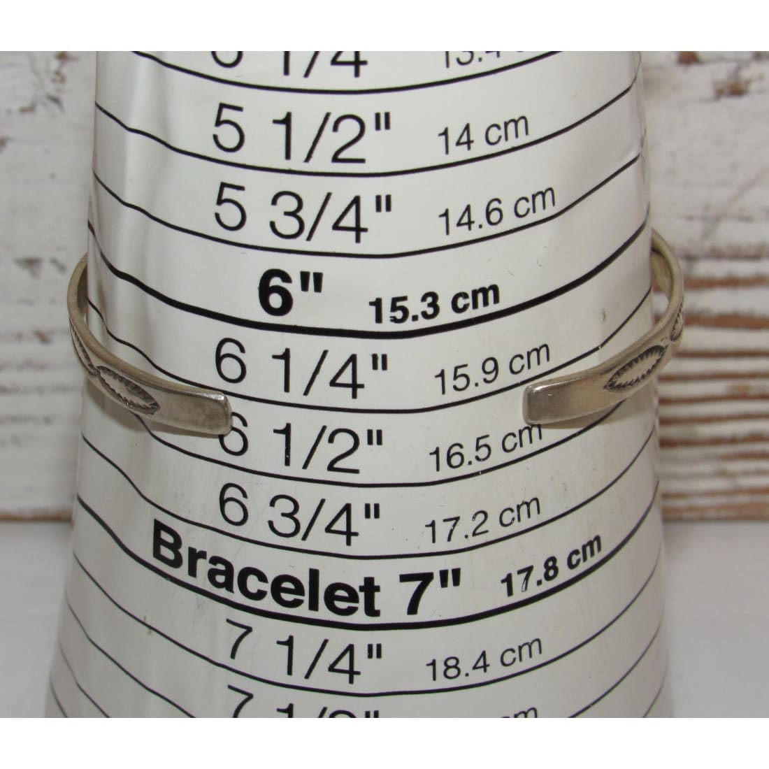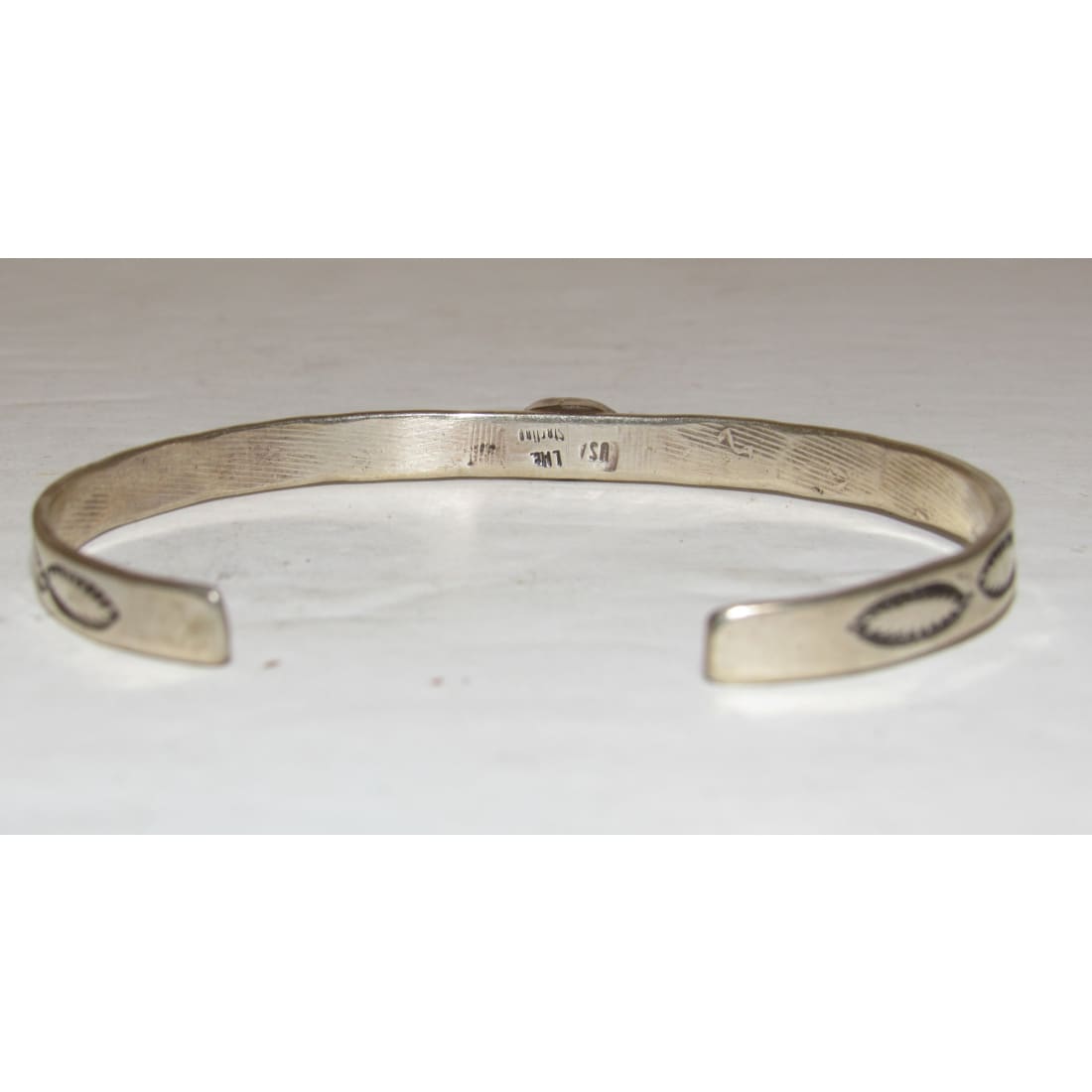 Navajo sterling silver stacker cuff bracelet featuring a natural Kingman turquoise cabochon with classic stamped details. Slim, clean profile makes it perfect for stacking or wearing alone for a subtle Southwestern look. Handcrafted in sterling silver with traditional Navajo design elements. Fits a wrist size of approximately 6¼-6½ inches (adjustable open cuff). A timeless Native American turquoise cuff with strong everyday wear appeal.