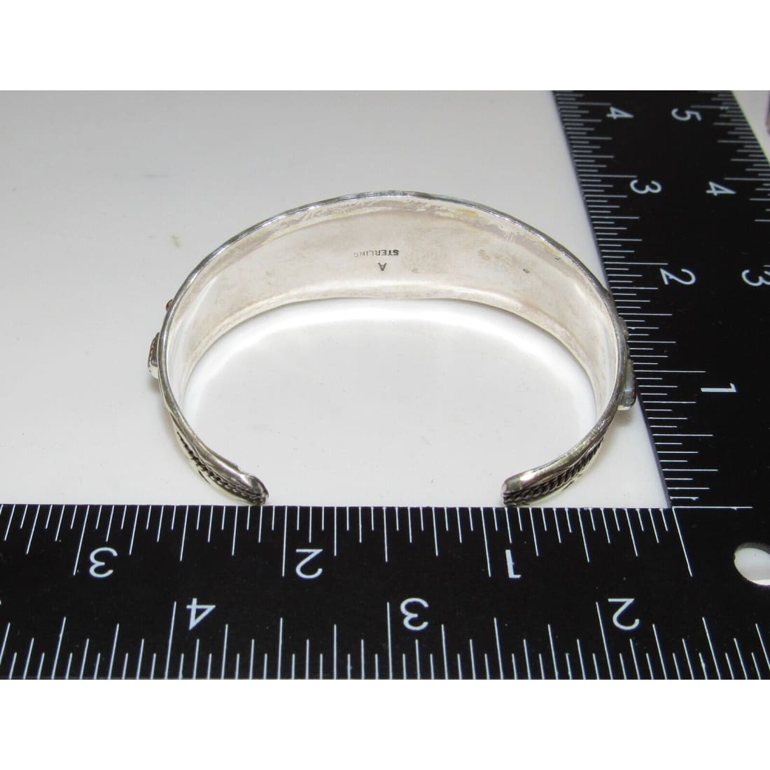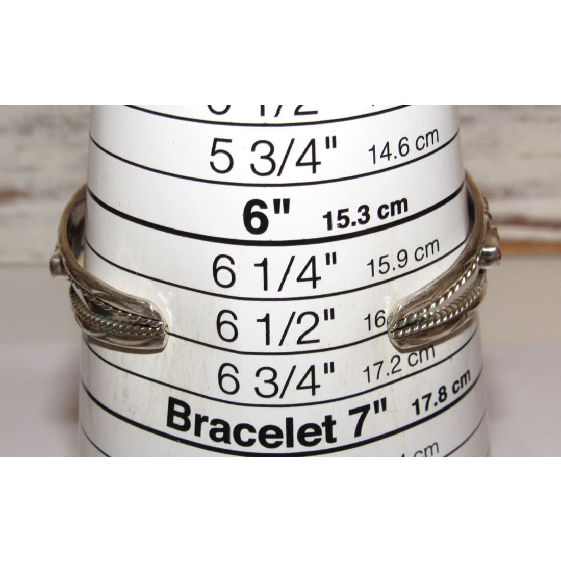 For your consideration is this fabulous Navajo sterling silver and free form Mediterranean coral statement cuff bracelet. The bracelet features a traditional hand etched tribal design in sterling silver accented with a cluster design of free form Mediterranean coral cabochons. Coral cabochons vary from piece to piece. The cuff measures about 6 1/2" inside circumference including gap. The gap is about 1 1/4" wide and can be carefully adjusted. The bracelet measures about 1" wide at the widest point and weighs about 30Gr. Marked "sterling" and stamped with the artist's hallmark. Wonderful addition to any jewelry collection!