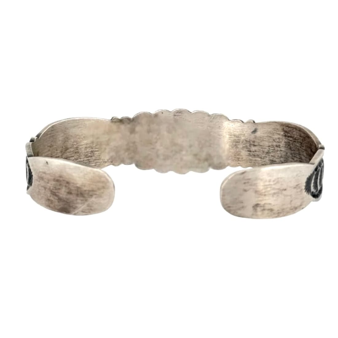 Phenomenal sterling silver & Sonoran Gold mine green turquoise Native American Navajo stacker cuff bracelet by the Navajo artist Bennie Ramone. Wonderful craftsmanship and attention to detail, intricately hand stamped tribal design. The inside circumference is about 7" including the gap. The gap is about 1 1/2". The cuff is adjustable. Stamped sterling, signed by the artist. Beautiful example of wearable Native American art to add to any jewelry collection. Great to add to your stacker cuff collection!
