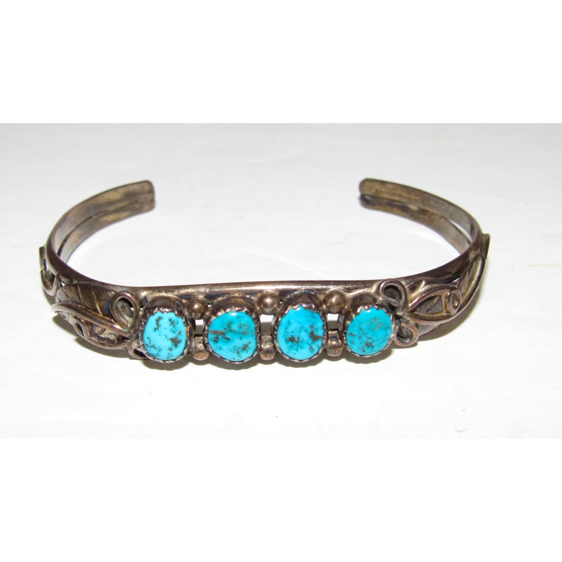 Vintage Navajo Kingman Turquoise Stacker Cuff Bracelet Sterling Silver. For your consideration is this fab Navajo sterling silver and Kingman turquoise stacker cuff bracelet. The cuff features a traditional, elegant squash blossom design in sterling silver accented with 4 beautiful Kingman turquoise cabochons on the front. The inside circumference for the cuff is about 6.5" including the gap. The cuff can be carefully adjusted. Unmarked as most vintage Native pieces from the time period. Tested. Great to stack with other bracelets! Wonderful addition to any jewelry collection!
