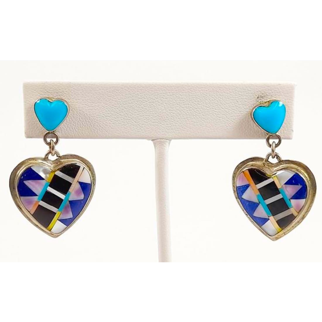 These gorgeous vintage Navajo sterling silver heart dangle earrings by renowned Native American artist Sandra Kenton feature intricate inlay work with turquoise, deep blue lapis lazuli, and shimmering mother of pearl. Measuring approximately 1 inch in length, they showcase traditional Southwestern craftsmanship in a graceful heart design. Signed on the back and in good vintage condition with natural patina, these earrings are a beautiful example of artisan Navajo jewelry. Perfect for collectors and lovers of Native American silver, these one-of-a-kind earrings make a timeless addition to any jewelry collection.