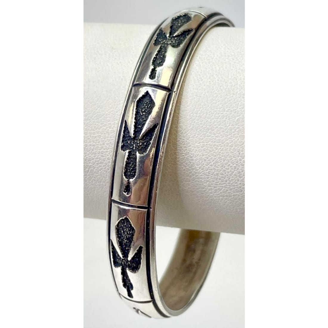 Rare vintage sterling silver bracelet by renowned Navajo artist Tommy Singer, featuring his iconic peyote bird design. The bold, raised and oxidized motif stands out against a high-polish silver surface, a signature style that makes Singer's work highly recognizable and widely collected.