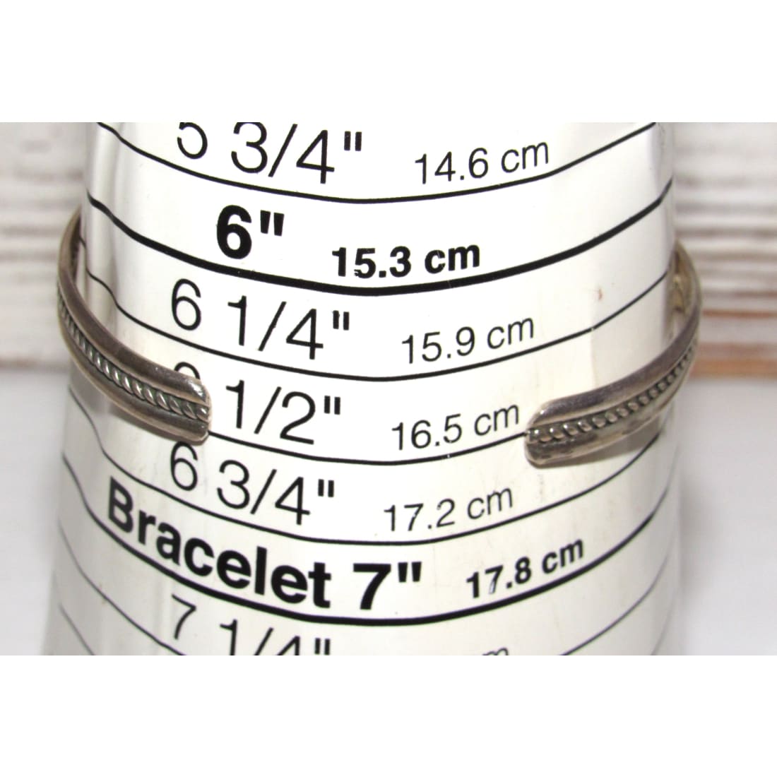 Measurements: 6 1/2" inside circumference including gap, the gap is about 1 1/2".