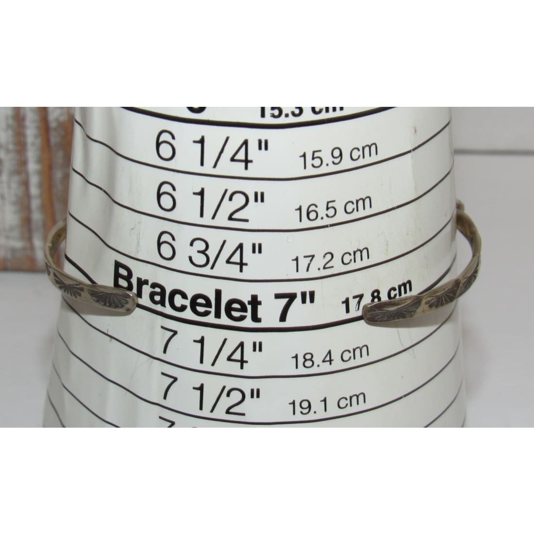 Native American Zuni sterling silver bracelet with a row of natural Sleeping Beauty petit point stone and hand stamped design on the ends of the shank. It measures 3/8" wide and tapers slightly at ends. Zuni hand made by Murray Hannaweeka. It is a 5 1/2" of silver with a 1 1/4" opening.